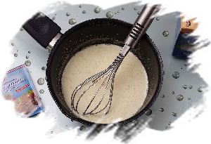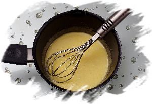 Затем сливки тонкой струйкой влить в желтковую смесь при постоянном интенсивном перемешивании венчиком.