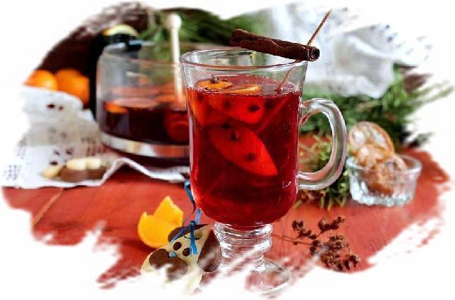Разливаем его по красивым бокалам, украшаем фруктовыми дольками, подаём к столу горячим.