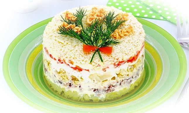 Осторожно, слегка вращая и поднимая вверх, снять формовочное кольцо. Украсить салат по своему усмотрению.