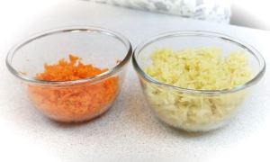 Картофель и морковь вымыть и, не очищая, по отдельности залить горячей подсоленной водой и отварить до мягкости. Затем обдать холодной водой, остудить, очистить и натереть на крупной тёрке, каждый овощ в отдельную чашку.