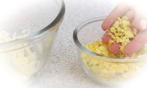 Белки и желтки натереть на мелкой тёрке в разные ёмкости.