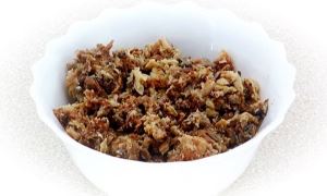 Далее берёмся за лук, желательно использовать красный, если такого нет, можно взять обычный. Луковицу очистить и очень мелко порубить.