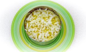 Четвёртый слой – измельчённый лук и майонез.