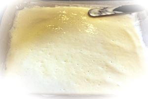 Разогреваем духовку до 190°С. Тем временем, готовим противень. Отрезаем по размеру и кладём на противень бумагу, предназначенную для выпекания. На неё выливаем получившееся тесто.