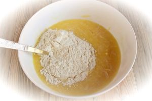 Все тщательно перемешиваем, всыпаем муку.