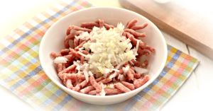 Очистите репчатый лук и мелко его нарубите. Мясной фарш смешайте с рубленным репчатым луком, приправьте по вкусу солью и молотым перцем.