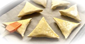 Яйцо взбейте вилкой и смажьте им поверхность каждой самсы.