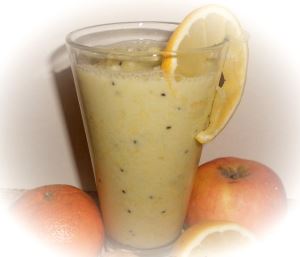 Яблоко сладкое, апельсин, киви, корень имбиря, лимонный сок, молоко.