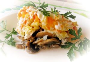 Сельдь, лук репчатый, маринованные грибы, морковь, картофель, майонез, масло растительное.