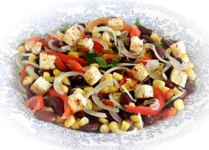 Фасоль, кукуруза, лук репчатый, перец болгарский, хлеб, петрушка, масло оливковое, чеснок, смесь перцев молотая, соль.