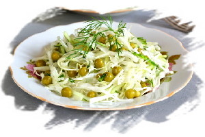 Капуста белокочанная, зелёный горошек, соль, сахар, лимон, укроп, масло оливковое.