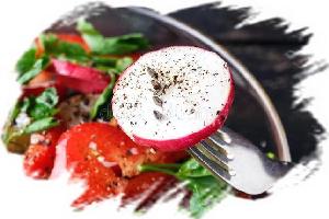 Редиска, помидор, зеленые листья салата, грецкие орехи, соль, масло подсолнечное, лимонный сок.