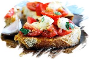 Батон, помидоры, брынза, чеснок, укроп, руккола, оливковое масло, соль, перец, специи.