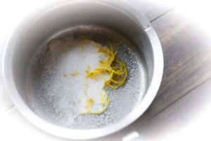 Для приготовления лимонного сиропа поместите сахар, воду и цедру в любую удобную жаропрочную ёмкость. Поставьте на средний огонь и ждите, пока сахар растворится полностью. После этого варите ещё минуту и снимите с огня. Помешивать здесь не нужно. Остудите.
