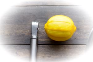 Используя специальный инструмент для цедры, сможете снять именно жёлтую часть кожуры. Либо натрите на тёрке, но так, чтобы не снять белую (горькую) прослойку.