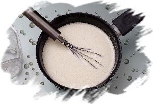 Затем сливки тонкой струйкой влить в желтковую смесь при постоянном интенсивном перемешивании венчиком.