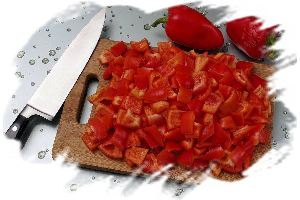 Болгарский перец очистить от семян и перегородок и нарезать квадратиками.