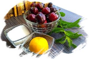 Для приготовления компота подготавить продукты по списку: черешня, лимон, мята, сахар.