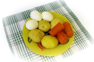 Морковь, картофель и яйца отварите, очистите и остудите.