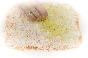 Расстелите пергаментную бумагу или фольгу и выложите на неё слоями морковь, картофель и яица, каждый слой слегка промазывая майонезом (или сметаной).