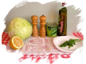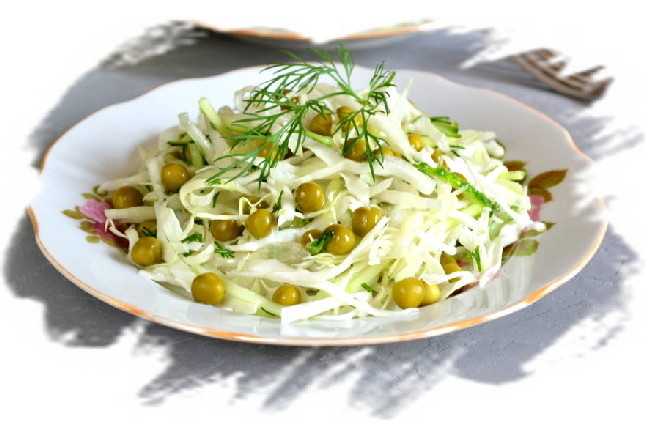Салат из капусты и зелёного горошка – лёгкий как по вкусу, так и в приготовлении.