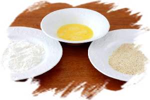 Приготовьте две тарелки и неглубокую широкую миску. В первую тарелку поместите смесь муки с солью. В миске слегка взбейте яйца. Ещё одну тарелку используйте для панировочных сухариков.