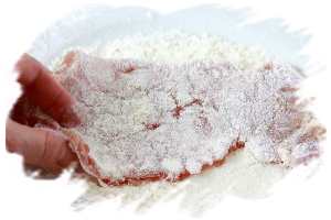 Обвалите мясной кусок в муке, покрывая обе его стороны и все края.