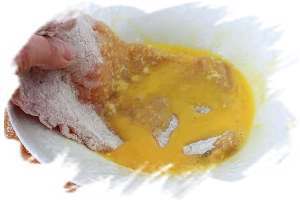 Затем погрузите свинину в яичную смесь, также покрывая обе стороны и все края.
