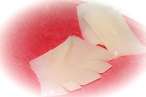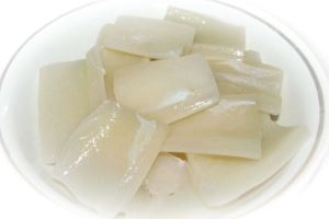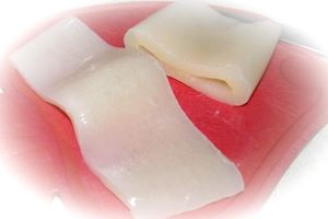 Обычно кальмары тщательно очищены, но иногда в них остаются хрящики (длинная полоска внутри тубы). При наличии хрящей в тушках кальмаров их удаляем.