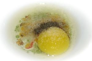 Затем кладём в одну тарелку пару столовых ложек пшеничной муки, а в другой взбиваем куриное яйцо с солью и чёрным молотым перцем.
