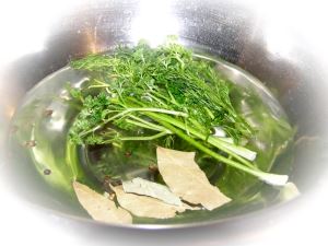 Наливаем в кастрюлю воду, кладем в неё специи – лавровый лист, перец горошком и зелень.