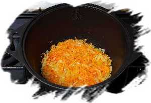 В толстостенной кастрюле или казане среднего размера разогреть растительное масло, положить лук и морковь и готовить на среднем огне 8–10 минут до подрумянивания и появления приятного аромата.
