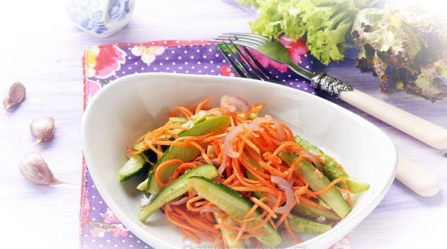 Соединить морковь, лук, огурцы, 2 ст.л. уксуса, очищенный и пропущенный через пресс чеснок (3 зубца). Перемешать. Оставить на 5 минут для маринования.