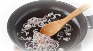 Лук (75 г) очистить, нарезать тонкими полукольцами и обжарить на подсолнечном масле (2 ст.л.) до прозрачности.