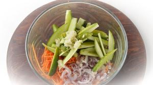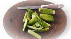 250 граммов огурцов нарезать тонкими, длинными кусочками.