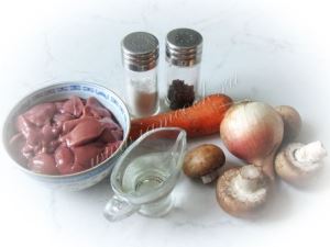Для приготовления понадобятся такие продукты: куриная печень, шампиньоны, лук репчатый, морковь, масло подсолнечное, соль и перец чёрный молотый.