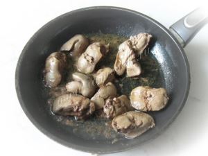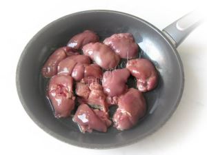 Печень моем, обрезаем протоки и жир. На сковороду наливаем подсолнечное масло, кладём кусочки куриной печени и накрываем крышкой.