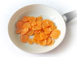 Пока печень тушится, чистим морковь, моем и нарезаем кружками. Кладём на сковороду с подсолнечным маслом.