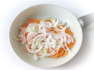 Лук репчатый чистим, моем и нарезаем полукольцами. Кладём на сковороду к моркови.
