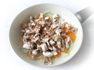 Шампиньоны чистим, моем и нарезаем произвольно. Добавляем к луку и моркови.