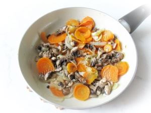 Морковь, лук и шампиньоны тушим на сковороде до готовности, пока овощи и грибы не станут мягкими. На это уйдёт минут 15.