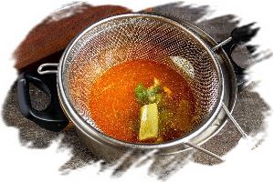 Процеживаем куриный бульон и вливаем в кастрюлю с овощами.