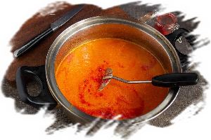 Измельчаем овощи с бульоном с помощью погружного блендера, добавляем молотую красную паприку, которая придаст супу яркий цвет и пряный аромат.