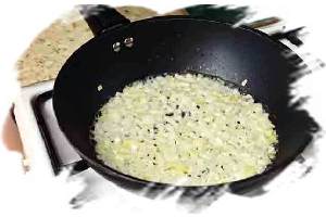 На сковороде с разогретым растительным маслом первым делом начинаем пассировать лук до тех пор, пока он начнёт слегка золотится.