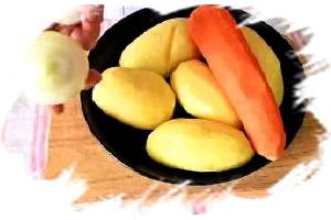 Кроме крапивы нам нужны будут ещё овощи: несколько картофелин средней величины, крупная морковь и пара головок репчатого лука.