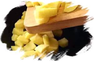 Картошку очищаем от кожуры и нарезаем небольшими кубиками или соломкой, кто как больше любит.