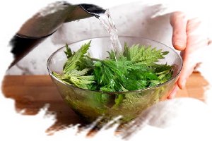 Как только вода в кастрюле закипит часть её используем, чтобы обдать крапиву кипятком.