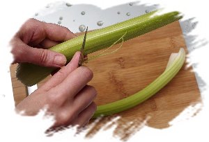 Сельдерей нужно сперва очистить от тонких жёстких волокон, которые пронизывают весь стебель вдоль. Для этого их нужно подцепить ножом с торца стебля и не спеша полностью вытянуть как с внешней, так и с внутренней стороны.