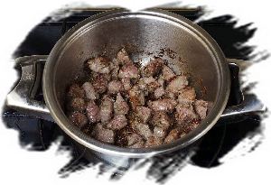 Мясо обвалять в муке, смешанной с солью и перцем, стряхнуть излишки и выложить в кастрюлю.