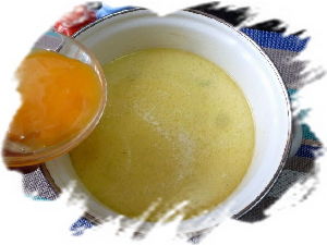 Добавить желток и тщательно мешать несколько минут деревянной ложкой.